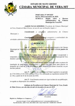 A Câmara Municipal de Vera informa que, conforme a Portaria nº 049/2025, estará em recesso administrativo no período de 15 de dezembro de 2025 a 16 de janeiro de 2026.